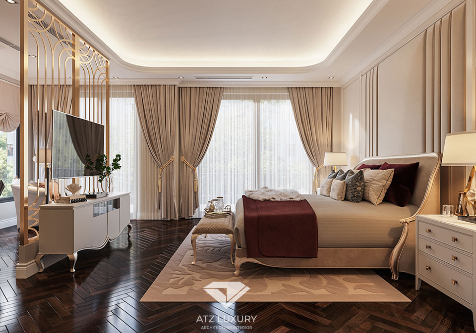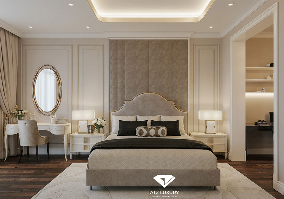 Theo kinh nghiệm của ATZ LUXURY, phòng ngủ biệt thự tân cổ điển cần được trang bị đầy đủ nội thất tiện nghi như: giường, tivi, kệ tivi, tủ quần áo, bàn trang điểm,… Các món đồ nội thất nên sở hữu họa tiết, điểm nhấn tân cổ điển tinh xảo như hoa văn, phào chỉ,… kết hợp với đèn chùm cỡ lớn để tạo nên không gian lung linh, lộng lẫy. Ngoài ra, bố cục phòng ngủ nên được bố trí và sắp xếp theo tỷ lệ vàng để mang đến sự hài hòa, cân đối và sang trọng.