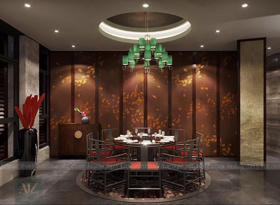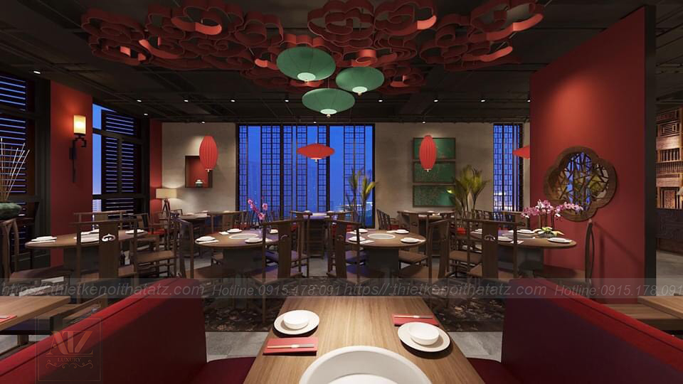 Mang tinh thần của nhà hàng phong cách Trung Hoa, nhà thiết kế ưu tiên sử dụng tone màu đỏ trầm chủ đạo tạo sự sang trọng và cổ điển, thêm vào đó là những chi tiết nội thất tinh tế mang đậm đà bản sắc văn hóa Trung Quốc