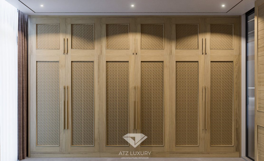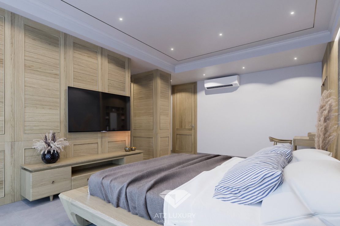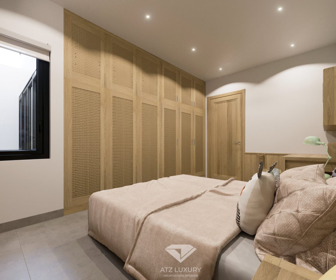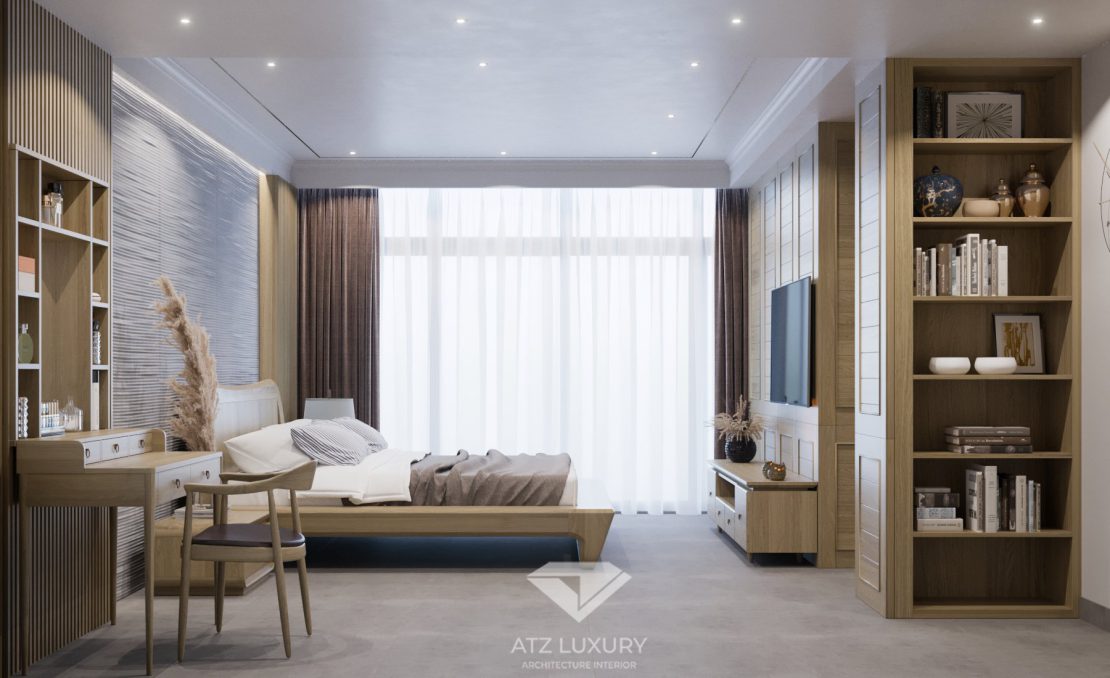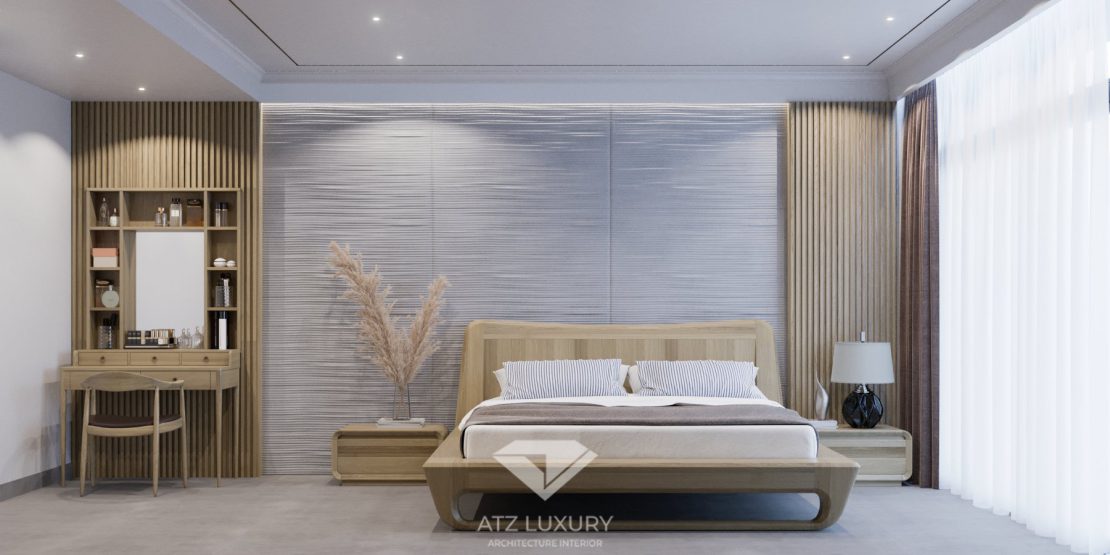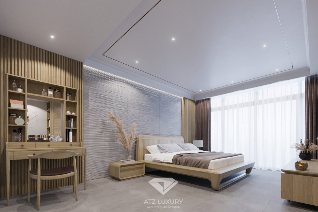 Phòng ngủ Master dành cho bố mẹ, ngoài các đồ nội thất như: bàn trang điểm, giường, tủ, tab đầu giường thì phòng ngủ còn được thiết kế thêm một không gian phòng thay đồ. Cùng đi vào chi tiết không gian phòng ngủ nhà chị Vân được ATZ thiết kế độc đáo như thế nào nhé!