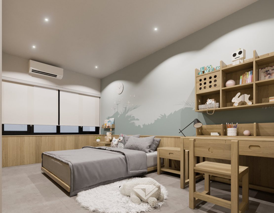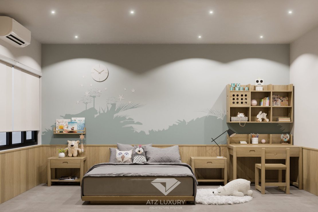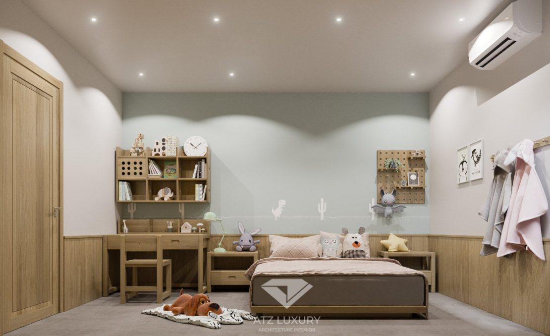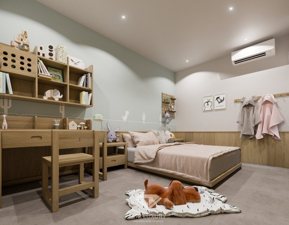 Tầng 4 là phòng ngủ của con với combo nội thất đầy đủ: bàn học, giường ngủ, kệ tủ, điều hoà,…