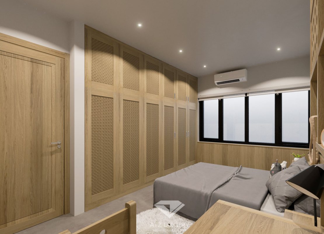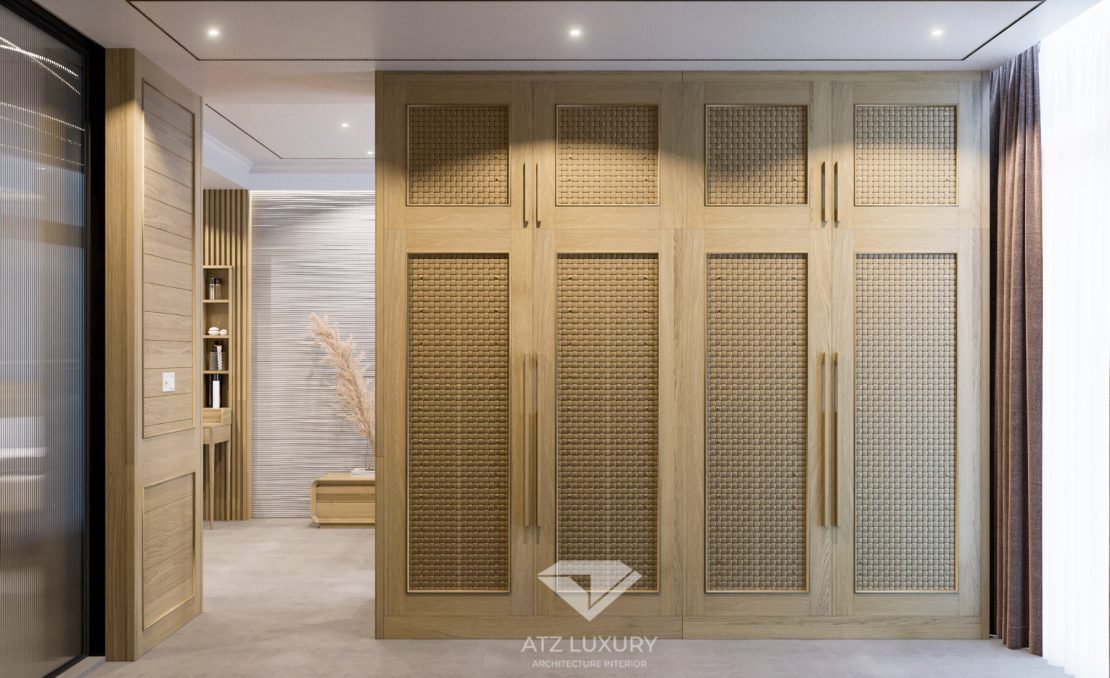 Sự khác biệt của phòng ngủ này so với các phòng khác đó chính là thiết kế phòng thay đồ. Phòng thay đồ không sử dụng vách ngăn là tường, thay vào đó là sử dụng vách ngăn tủ gỗ, vừa làm tủ đựng đồ lại tạo vách ngăn riêng tư. Đồng thời tiết kiệm chi phí và cả diện tích không gian.