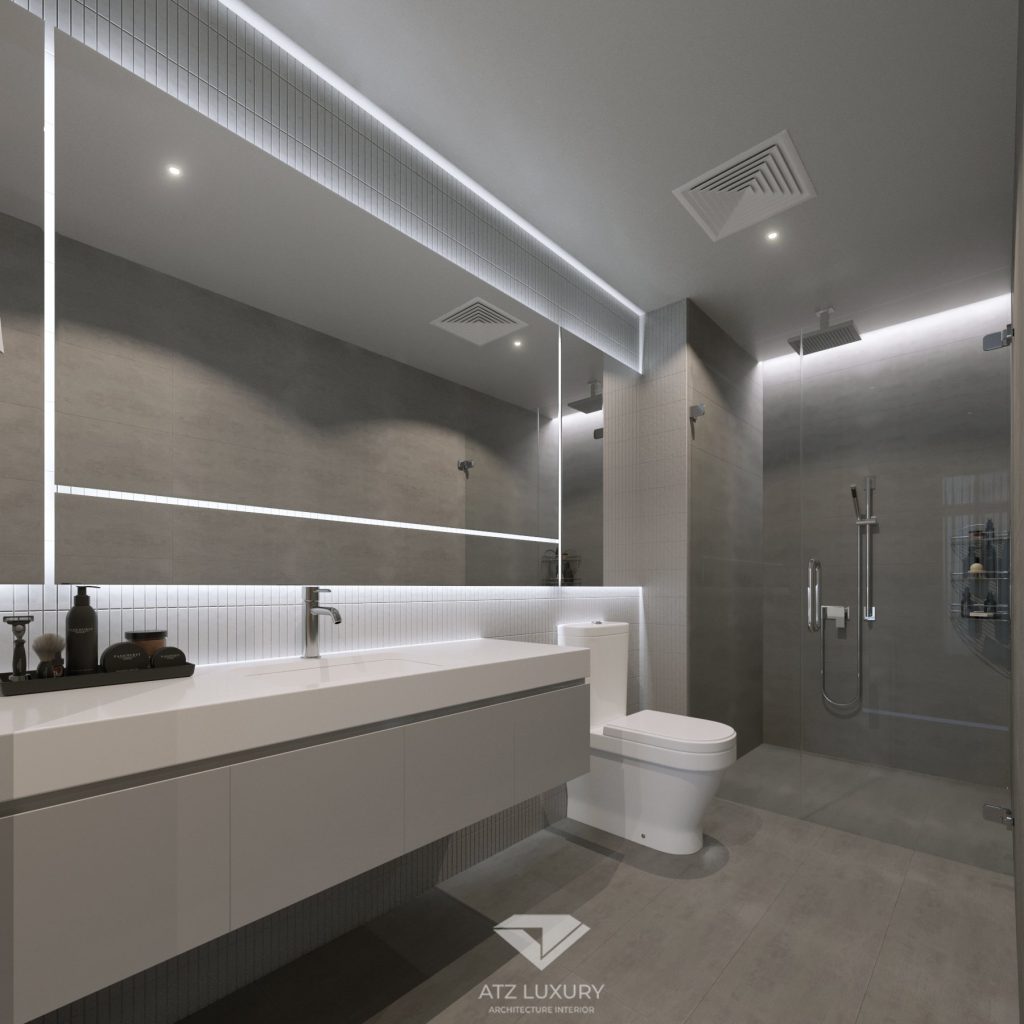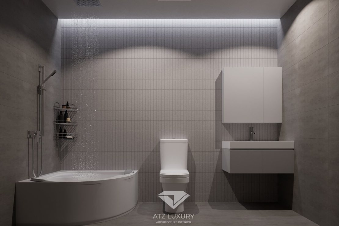 Bồn tắm đặt ở góc để tiết kiệm diện tích hơn, giúp tạo khoảng không gian đi lại được rộng hơn, thoải mái hơn. Màu xám trầm là màu chủ đạo của không gian phòng tắm, tạo sự nhẹ nhàng, cảm giác thoải mái để có thể “chill” sau một ngày dài mệt mỏi.