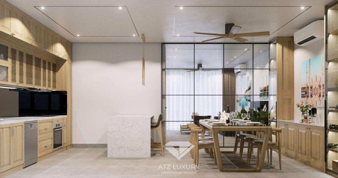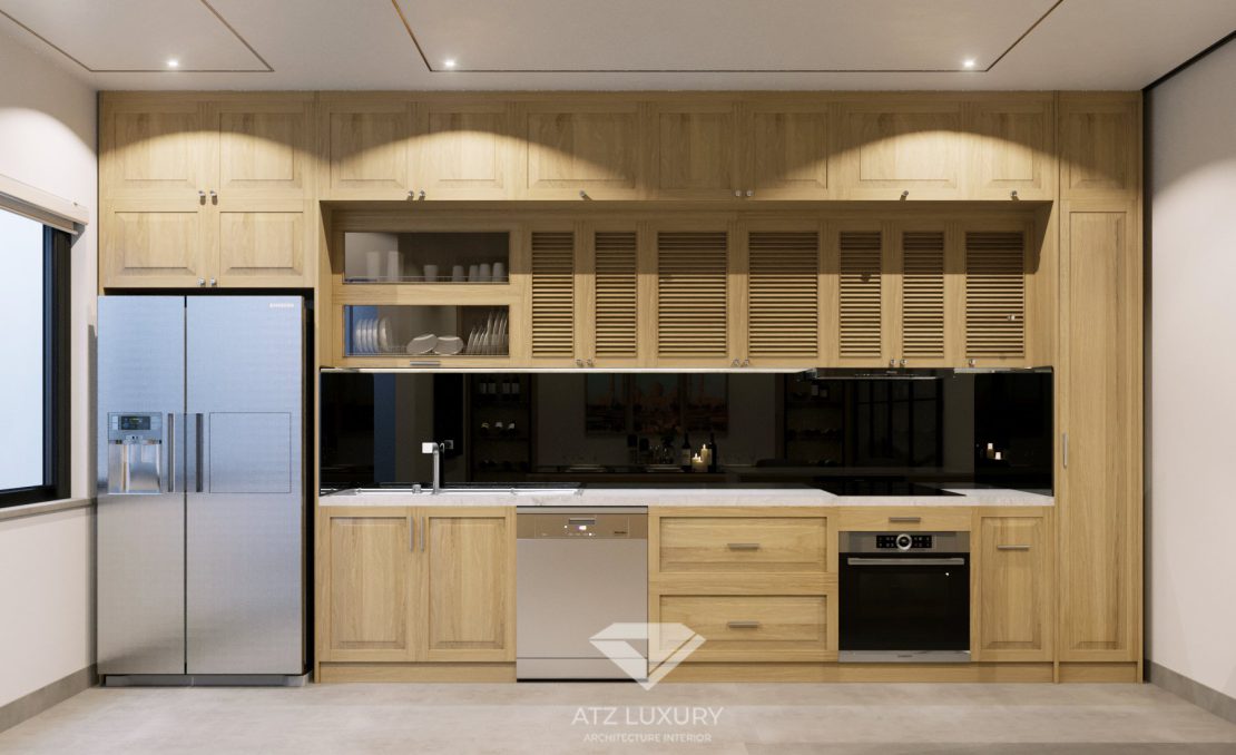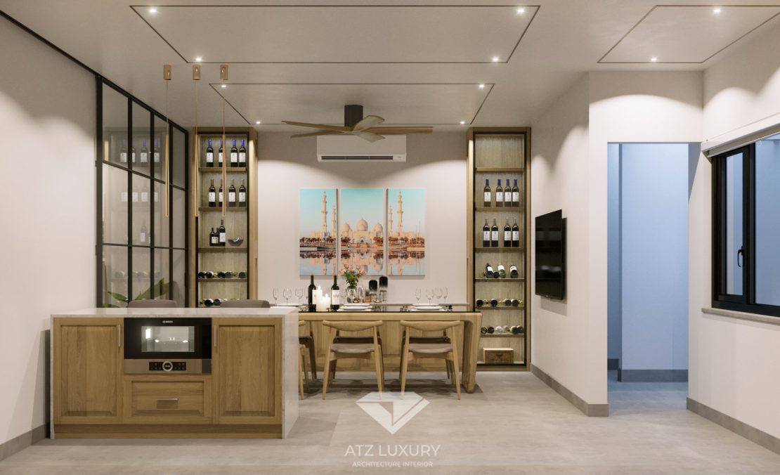 Ngoài ra, để tiết kiệm diện tích và dành diện tích đó để đặt bàn ăn, không gian chung đi lại thoải mái thì KTS lựa chọn thiết kế tủ bếp, tủ lạnh, và tủ rượu âm tường.