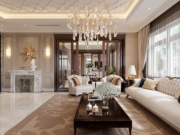 Thiết kế nội thất phòng khách đẹp sang trọng phong cách tân cổ điển