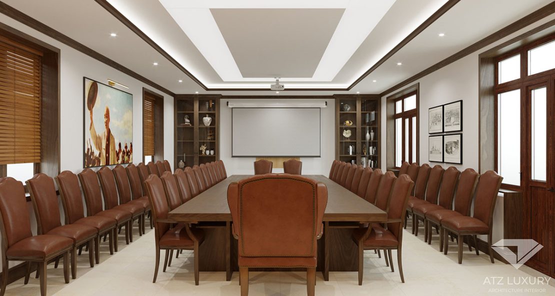 Đối với phòng họp lớn, ATZ đề xuất 2 phương án thiết kế. Cả 2 phương án có điểm giống nhau là bàn ghế họp cỡ lớn. Đồng thời, phòng họp còn có ghế phụ để sử dụng khi cần thiết. Để phòng họp không quá trang trọng, kiến trúc sư đã treo thêm tranh để trang trí.