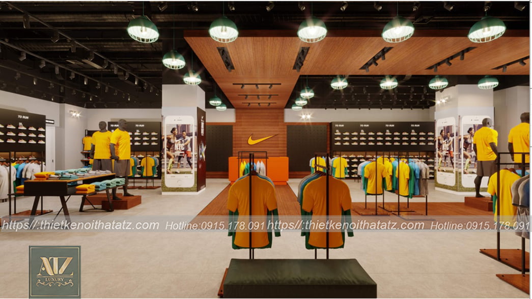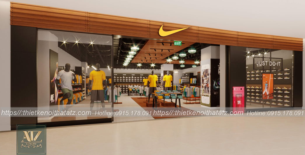 Hệ trần ốp các hộp kỹ thuật sơn đen làm nền cho mảng gỗ ốp chính treo hệ đèn ánh sáng công suất lớn làm sáng bừng gian hàng cho mọi góc đều khoe được vẻ đẹp sang trọng lịch lãm. Trên các diện tường chính là vị trí bày các mặt hàng giầy thể thao, là một mảng sản phẩm đặc biệt nhất trong thương hiệu Just do it. Phòng thử đồ rộng rãi bố trí khoa học hợp lý cũng là một điểm gây cảm giác dễ chịu khi tham gia mua sắm ở đây.