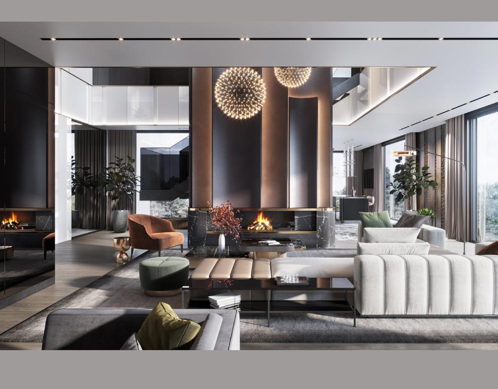 Các chi tiết mặt đá cẩm thạch, kính, gương, thủy tinh, kim loại, và các mặt bóng có mức độ hoàn thiện cao được ứng dụng khéo léo trong nhiều hình dáng. Thiết kế nội thất nhà sang trọng hiện đại chủ yếu là các đường thẳng và sạch sẽ, hầu như không sử dụng các đường cong hoặc chi tiết phức tạp. Các hình dạng hình học đơn giản và kiểu dáng đẹp, chuẩn chỉnh xuất hiện rất nhiều trong không gian này. Điều nâng tầm các hình dạng cơ bản này chính là chất liệu và sắc độ của chúng.