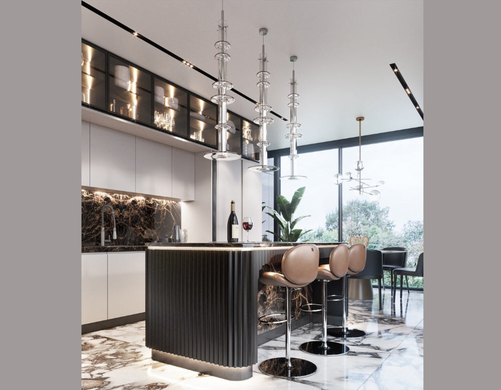 Đảo quầy bar được phủ lớp vật liệu kim loại màu đen xung quanh để hấp thụ ánh sáng tốt hơn, tạo không gian tĩnh và trung hòa cho khu vực bar. Dãy ghế da rất đẹp và mịn với vòng tròn gác chân là một điểm cộng lớn, tạo tư thế thoải mái khi ngồi. Để tăng công năng sử dụng, đảo quầy bar này nhiều khi cũng được dùng như bàn ăn, vì vậy dàn máy hút mùi rất phong cách lại còn tinh gọn được lựa chọn lắp đặt ngay trên quầy bar.