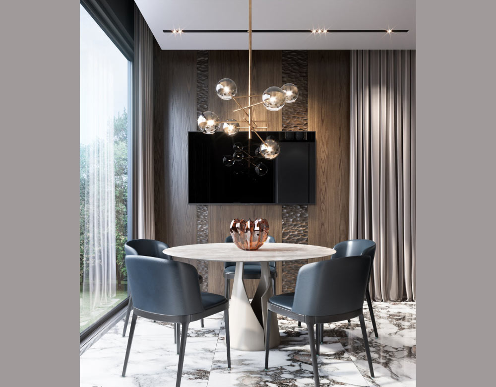 Không gian bếp ăn được trang bị tivi riêng với đèn chùm lạ mắt. Riêng góc này được trang trí tiết chế hơn để tập trung vào không khí ấm cúng cho gia đình gia chủ trong các cuộc họp mặt gặp gỡ. Duy chỉ có sàn nhà lót gạch họa tiết đá cẩm thạch là chi tiết âm thầm tạo ra sự cầu kì một cách nền nã sang trọng.