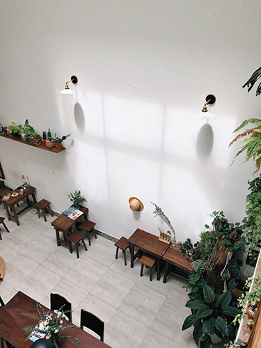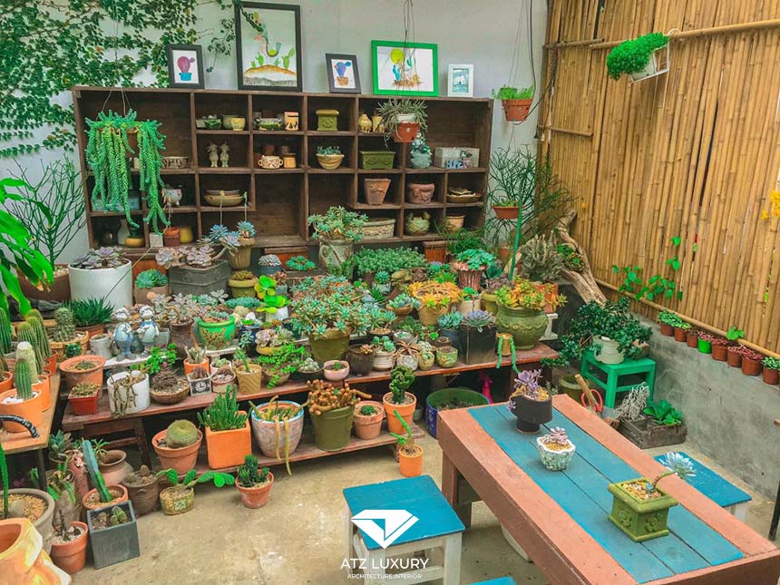 Quán tuy có không gian hơi nhỏ nhưng kiến trúc nội thất cổ xưa, điểm xuyến thêm những chậu cây mini sẽ mang đến không gian gần gũi, thân thiện và tràn đầy sức sống.