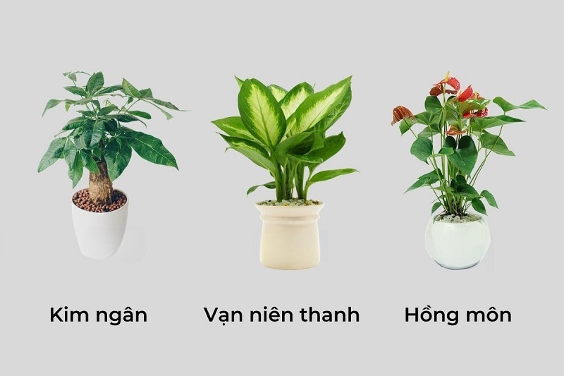 Một số cây nên chọn như cây vạn niên thanh giúp giải trừ sát khí và tăng cường năng lượng tích cực, cây hồng môn mang lại nhiều may mắn trong tình yêu và giúp gia chủ thuận lợi trong công việc và tình cảm, còn cây kim ngân giúp đem lại vận may và tài lộc cho gia đình.